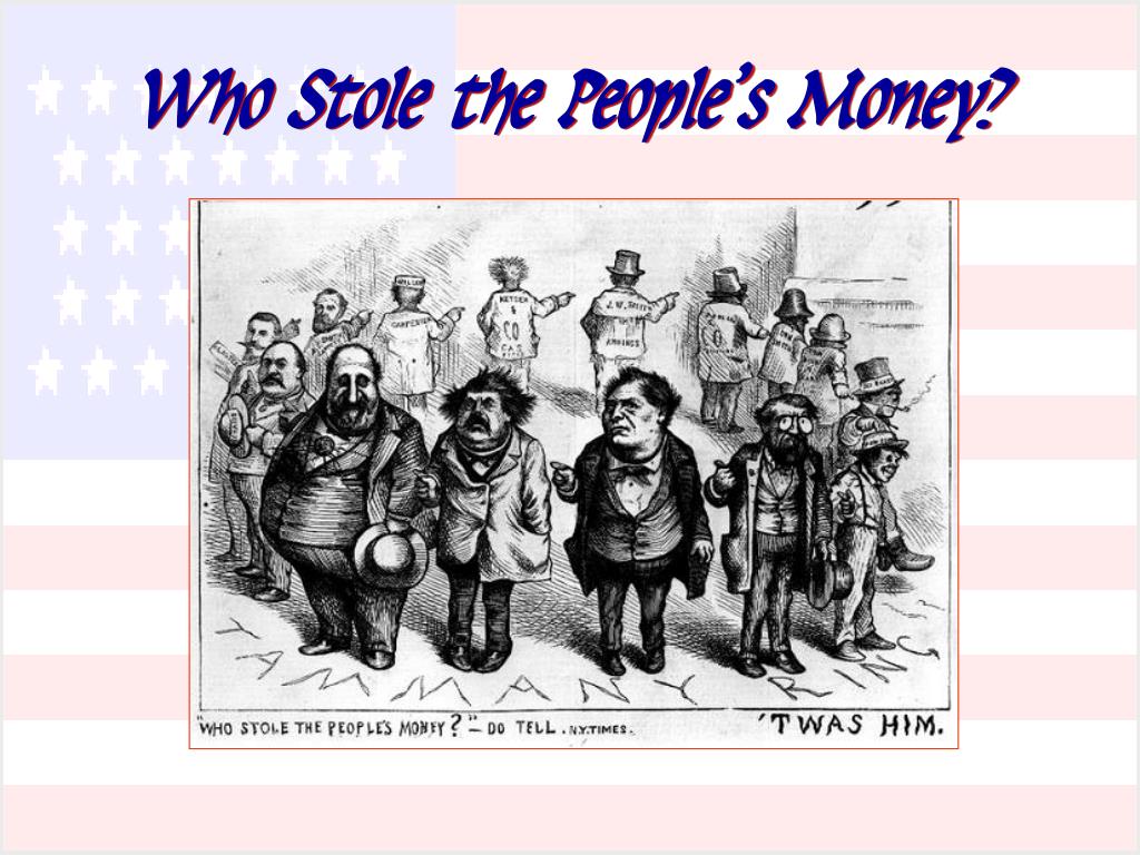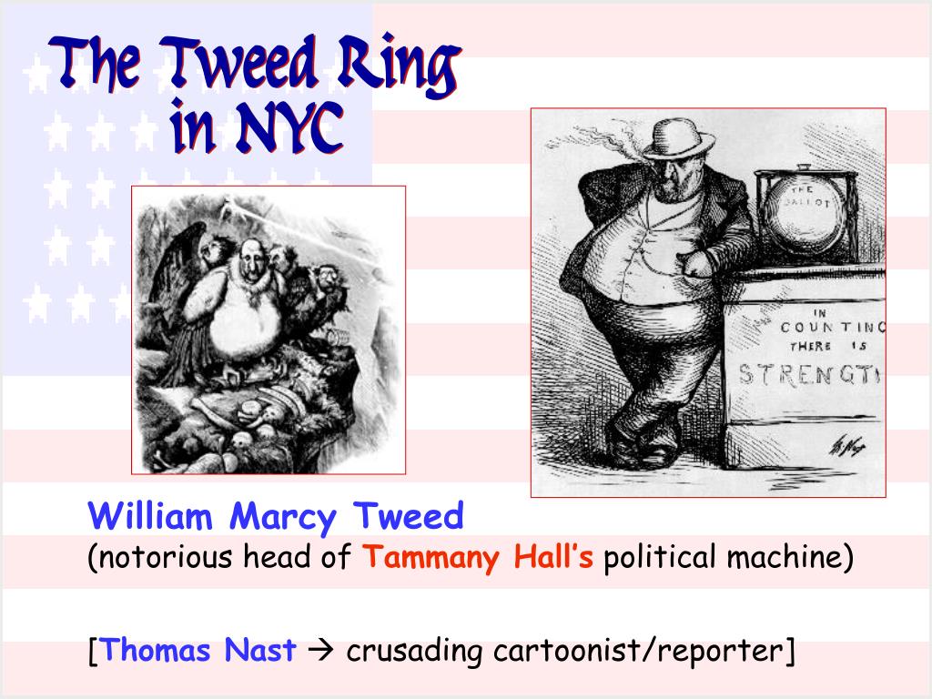 The Tweed Ring in NYC William Marcy Tweed (notorious head of Tammany Hall’s political machine) [Thomas Nast crusading cartoonist/reporter]