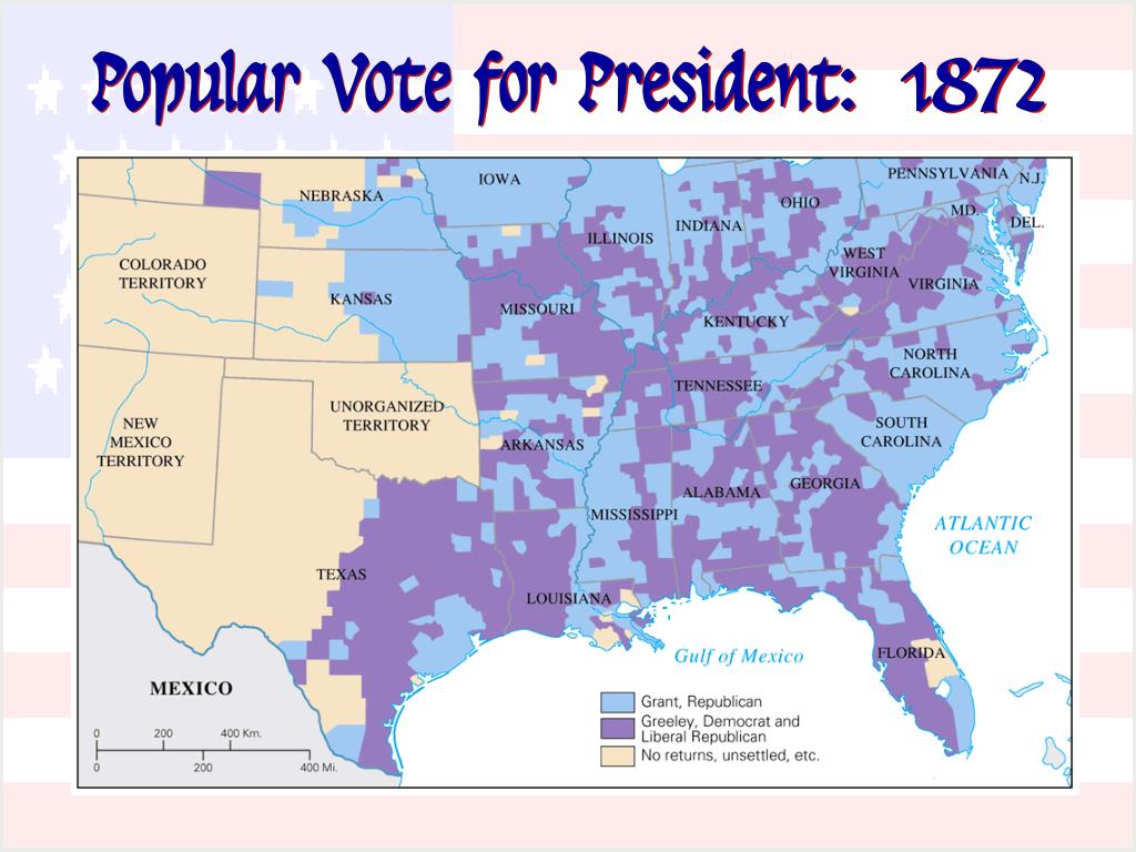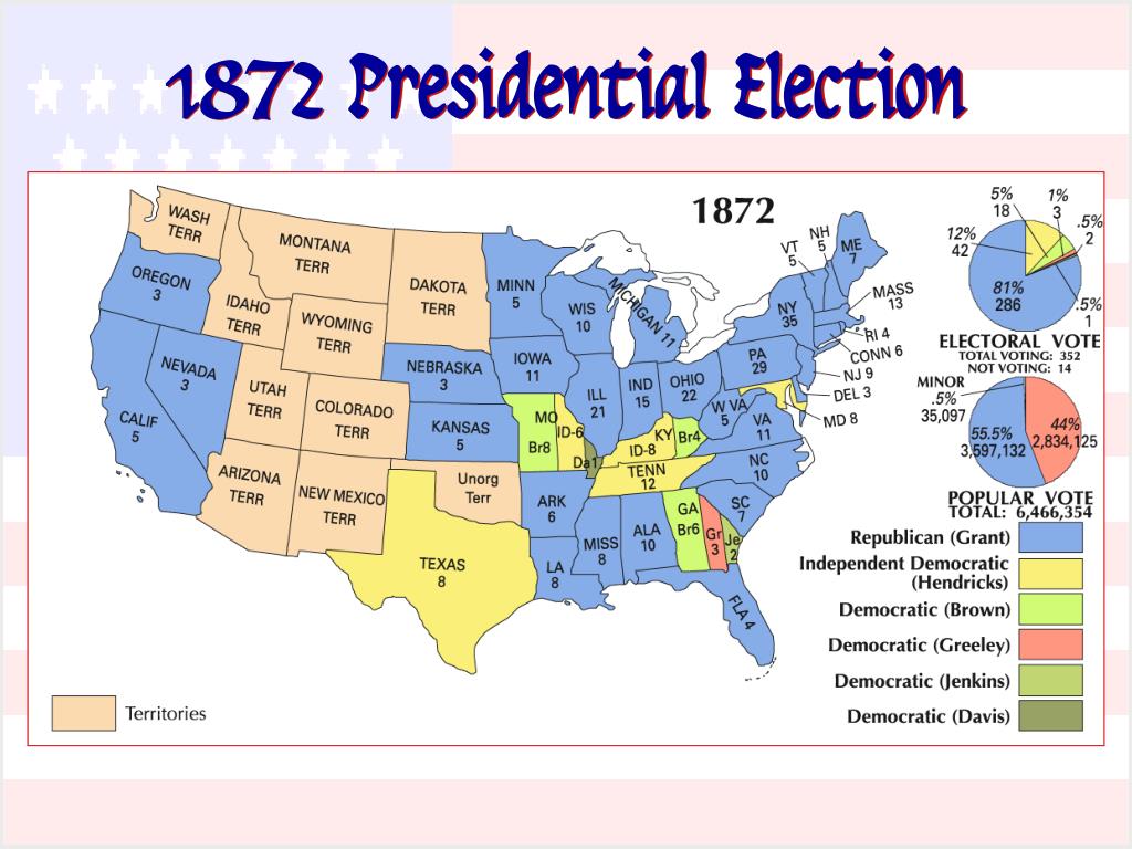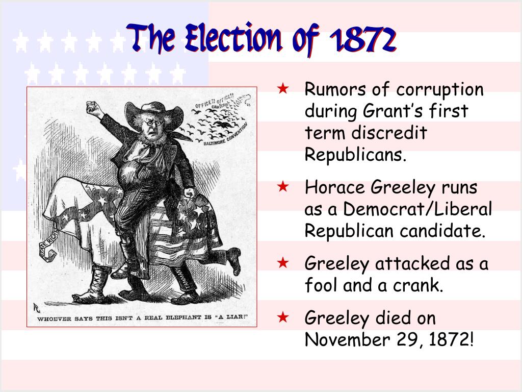 The Election of 1872 • Rumors of corruption during Grant’s first term discredit Republicans. • Horace Greeley runsas a Democrat/LiberalRepublican candidate. • Greeley attacked as afool and a crank. • Greeley died on November 29, 1872!