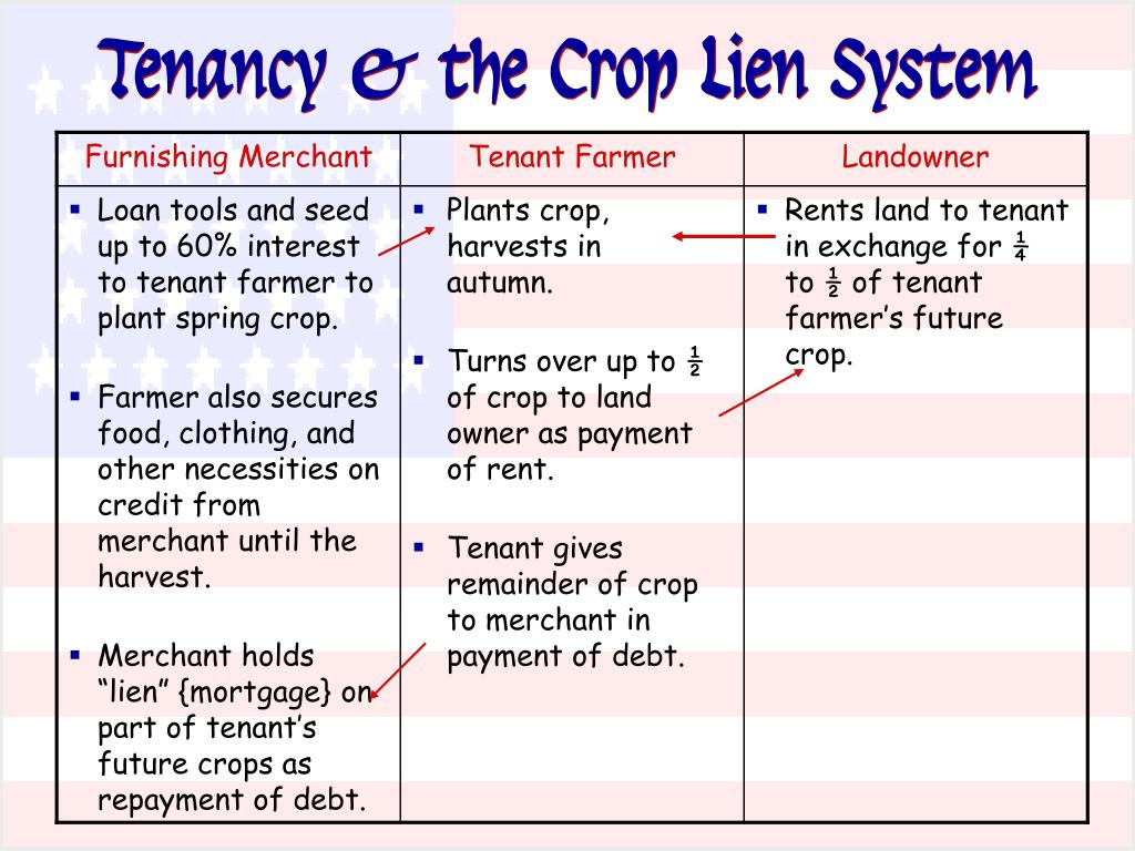 Black Codes • Purpose: • Guarantee stable labor supply now that blacks were emancipated. • Restore pre-emancipationsystem of race relations. • Forced many blacks to become sharecroppers[tenant farmers].