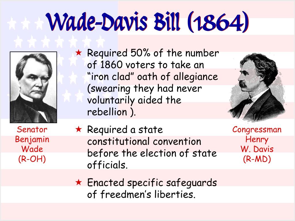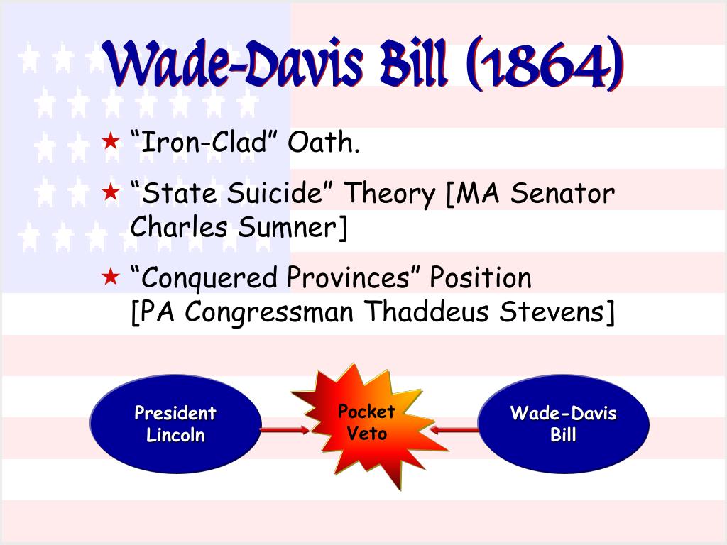 Wade-Davis Bill (1864) • “Iron-Clad” Oath. • “State Suicide” Theory [MA Senator Charles Sumner] • “Conquered Provinces” Position[PA Congressman Thaddeus Stevens] PocketVeto PresidentLincoln Wade-DavisBill