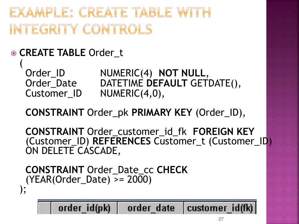 Example: CREATE TABLE WITH INTEGRITY CONTROLS • CREATE TABLE Order_t ( Order_ID NUMERIC(4) NOT NULL, Order_Date DATETIME DEFAULT GETDATE(), Customer_ID NUMERIC(4,0), CONSTRAINTOrder_pkPRIMARY KEY (Order_ID), CONSTRAINTOrder_customer_id_fkFOREIGN KEY (Customer_ID) REFERENCESCustomer_t (Customer_ID) ON DELETE CASCADE, CONSTRAINTOrder_Date_ccCHECK (YEAR(Order_Date) >= 2000) );