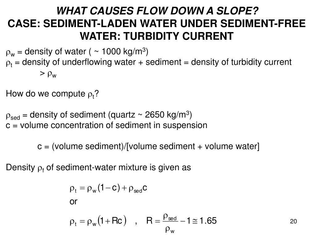 WHAT CAUSES FLOW DOWN A SLOPE? CASE: SEDIMENT-LADEN WATER UNDER SEDIMENT-FREE WATER: TURBIDITY CURRENT w = density of water ( ~ 1000 kg/m3) t = density of underflowing water + sediment = density of turbidity current > w How do we compute t? sed = density of sediment (quartz ~ 2650 kg/m3) c = volume concentration of sediment in suspension c = (volume sediment)/[volume sediment + volume water] Density f of sediment-water mixture is given as