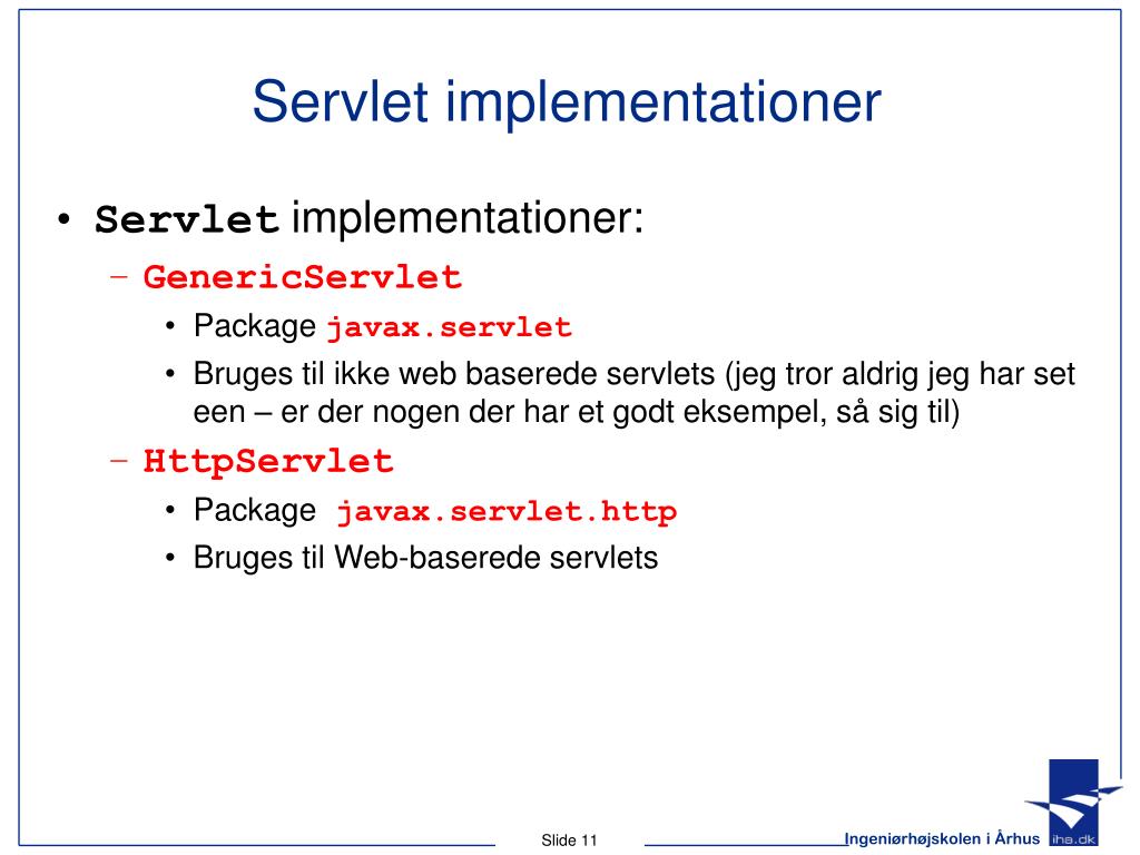 Servlet implementationer • Servlet implementationer: • GenericServlet • Package javax.servlet • Bruges til ikke web baserede servlets (jeg tror aldrig jeg har set een – er der nogen der har et godt eksempel, så sig til) • HttpServlet • Packagejavax.servlet.http • Bruges til Web-baserede servlets