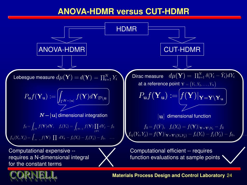 ANOVA-HDMR versus CUT-HDMR HDMR ANOVA-HDMR CUT-HDMR Dirac measure Lebesgue measure at a reference point dimensional integration dimensional function Computational expensive -- requires a N-dimensional integral for the constant terms Computational efficient -- requires function evaluations at sample points