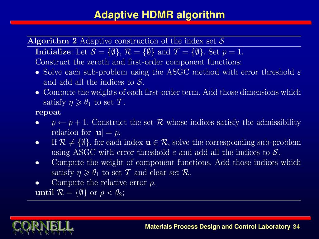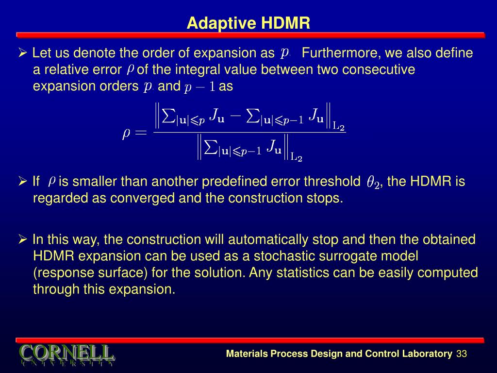 Adaptive HDMR • For extremely high dimensional problems, even a 2nd order expansion is impractical due to the increase of the number of component functions. Therefore, we would like to develop an adaptive version of HDMR for automatically and simultaneously detecting the truncation and superposition dimensions. • We assume each component function is associated with a weight which describes the contribution of the term to the HDMR. • First, we try to find the important dimensions. To this end, we always construct the 0th - and 1st-order HDMR expansion. We define a weight: Then we define the important dimensions as those whose weights are larger than a predefined error threshold . Only higher-order terms which consist of only these important dimensions are considered. Here, the norm is defined in the spatial domain.