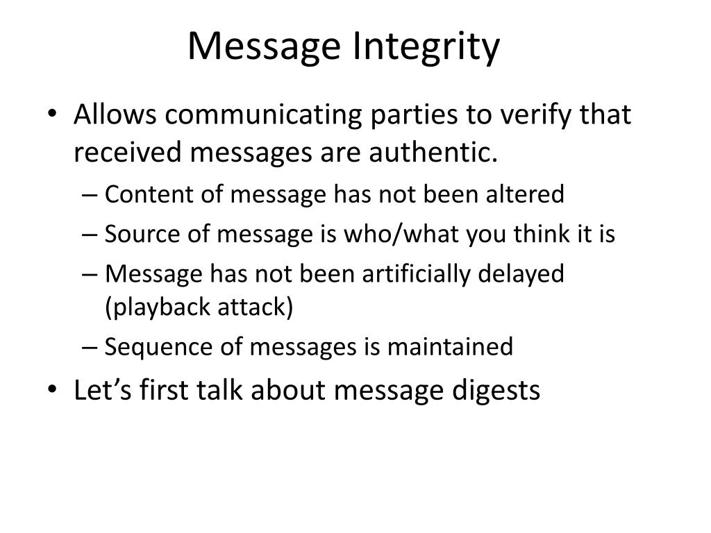 Message Integrity • Allows communicating parties to verify that received messages are authentic. • Content of message has not been altered • Source of message is who/what you think it is • Message has not been artificially delayed (playback attack) • Sequence of messages is maintained • Let’s first talk about message digests
