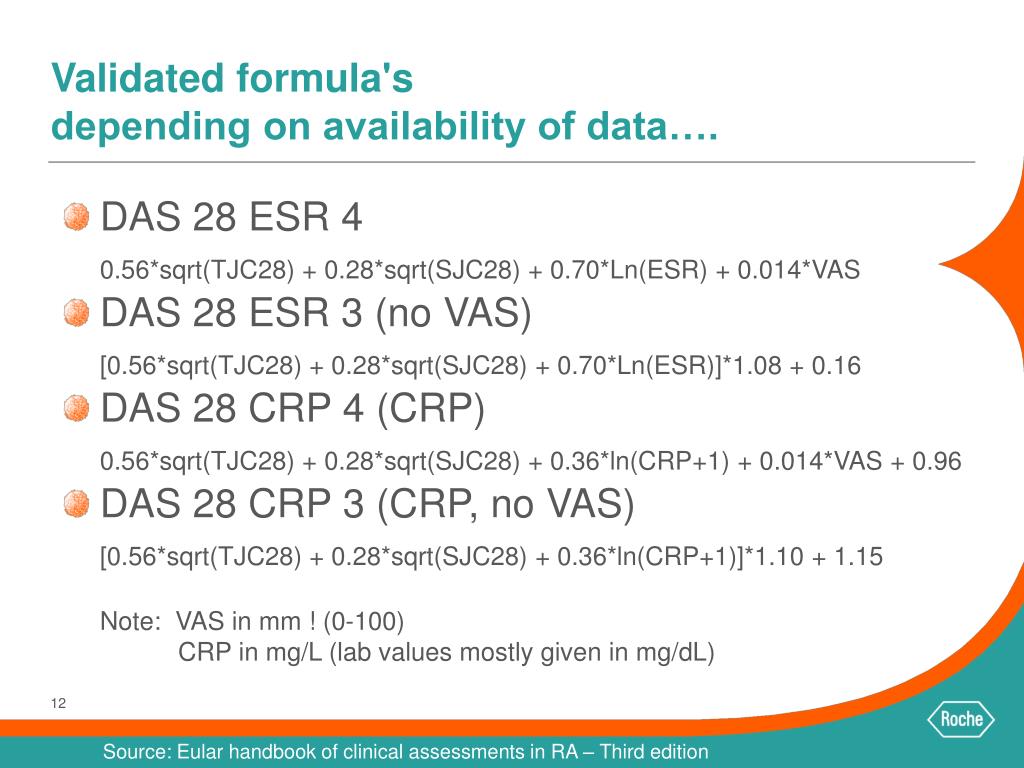 Validated formula's depending on availability of data…. • DAS 28 ESR 4 0.56*sqrt(TJC28) + 0.28*sqrt(SJC28) + 0.70*Ln(ESR) + 0.014*VAS • DAS 28 ESR 3 (no VAS) [0.56*sqrt(TJC28) + 0.28*sqrt(SJC28) + 0.70*Ln(ESR)]*1.08 + 0.16 • DAS 28 CRP 4 (CRP) 0.56*sqrt(TJC28) + 0.28*sqrt(SJC28) + 0.36*ln(CRP+1) + 0.014*VAS + 0.96 • DAS 28 CRP 3 (CRP, no VAS) [0.56*sqrt(TJC28) + 0.28*sqrt(SJC28) + 0.36*ln(CRP+1)]*1.10 + 1.15 Note: VAS in mm ! (0-100) CRP in mg/L (lab values mostly given in mg/dL) Source: Eular handbook of clinical assessments in RA – Third edition