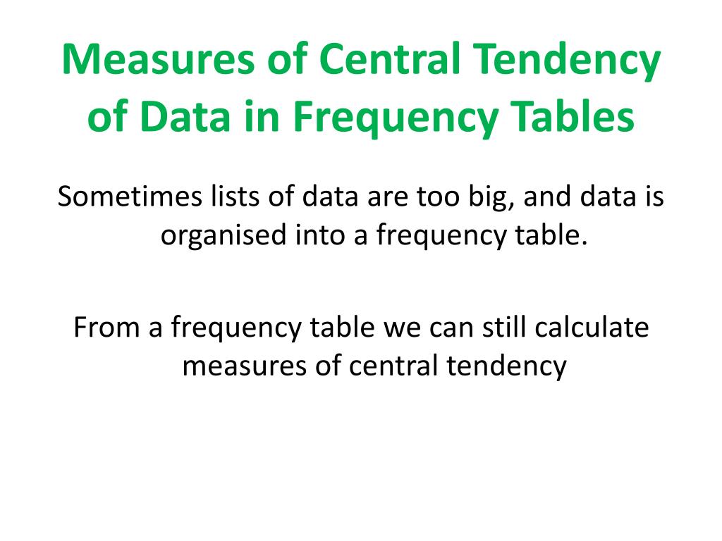Measures of Central Tendency of Data in Frequency Tables Sometimes lists of data are too big, and data is organised into a frequency table. From a frequency table we can still calculate measures of central tendency