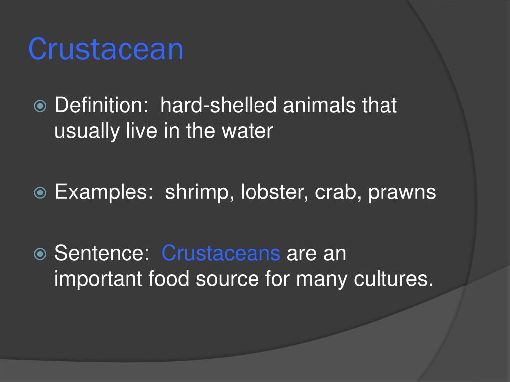 Vocabulary. Beneath Blue Waters Vocabulary. Crustacean. Definition: hard-shelled animals that usually live in the water Examples: shrimp, lobster, crab, prawns Sentence : Crustaceans are an important food source for many cultures. Crustaceans. Gelatinous.