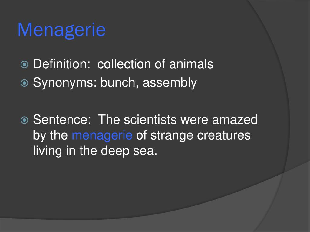 Menagerie • Definition: collection of animals • Synonyms: bunch, assembly • Sentence: The scientists were amazed by the menagerie of strange creatures living in the deep sea.