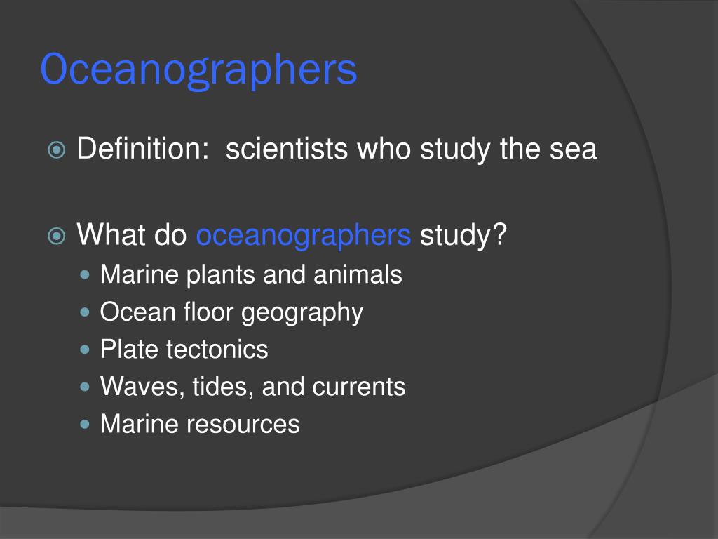 Oceanographers • Definition: scientists who study the sea • What do oceanographers study? • Marine plants and animals • Ocean floor geography • Plate tectonics • Waves, tides, and currents • Marine resources