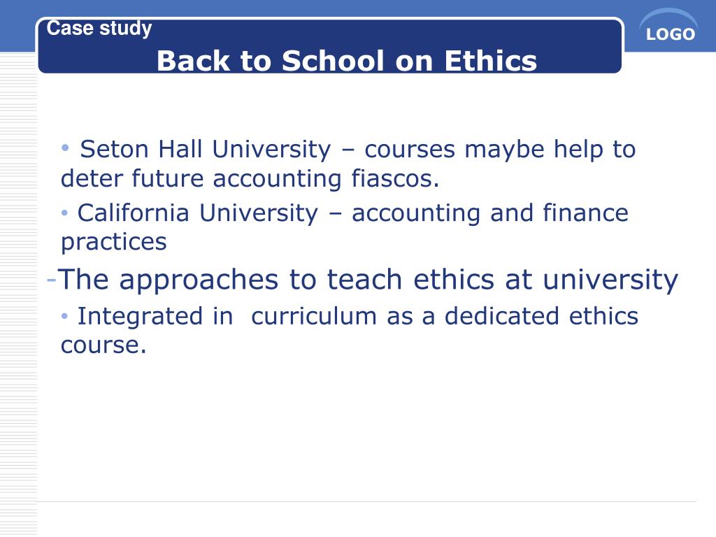 Case studyBack to School on Ethics • Seton Hall University – courses maybe help to deter future accounting fiascos. • California University – accounting and finance practices • The approaches to teach ethics at university • Integrated in curriculum as a dedicated ethics course.