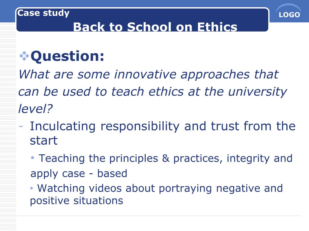 Case study Back to School on Ethics • Question: What are some innovative approaches that can be used to teach ethics at the university level? • Inculcating responsibility and trust from the start • Teaching the principles & practices, integrity and apply case - based • Watching videos about portraying negative and positive situations