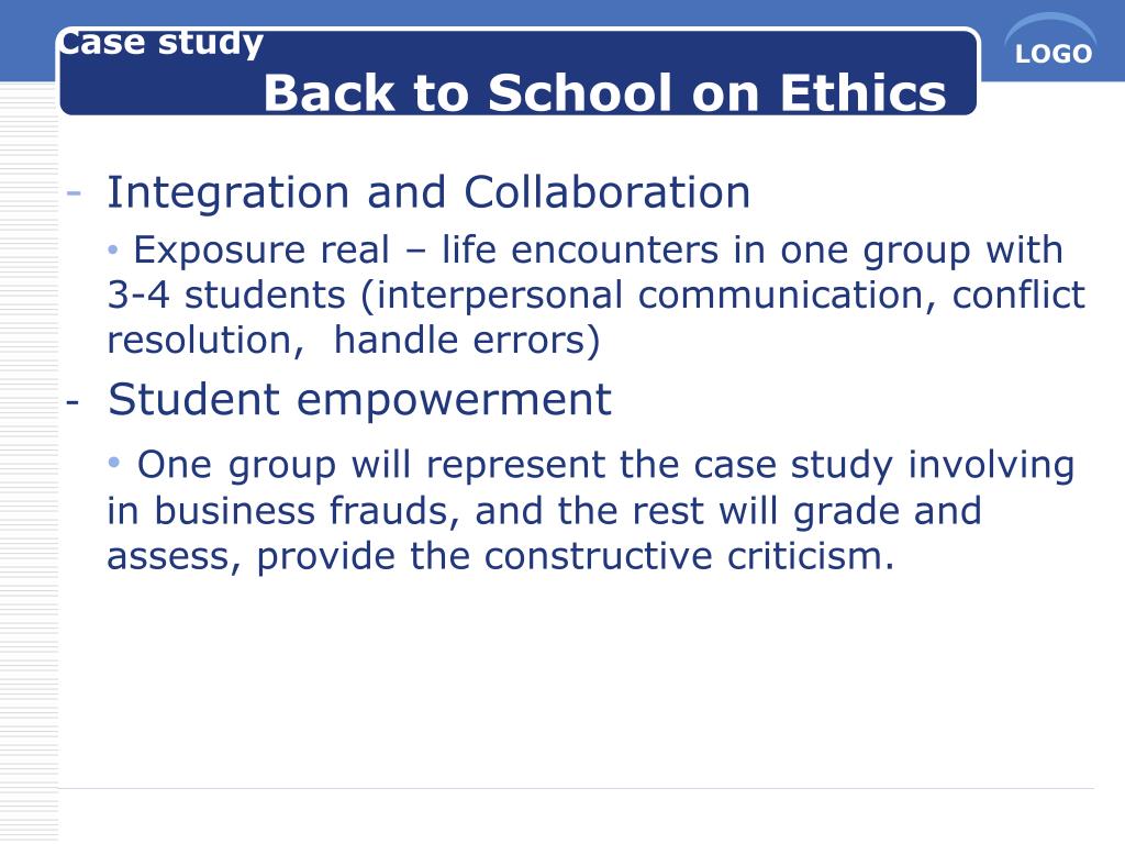 Case study Back to School on Ethics • Integration and Collaboration • Exposure real – life encounters in one group with 3-4 students (interpersonal communication, conflict resolution, handle errors) - Student empowerment • Onegroup will represent the case study involving in business frauds, and the rest will grade and assess, provide the constructive criticism.