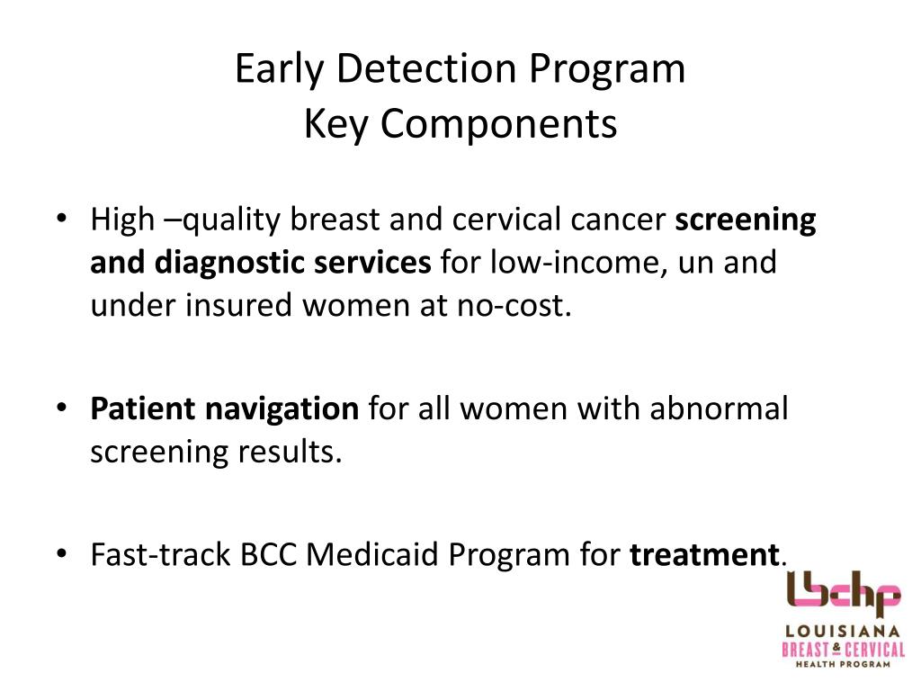 Early Detection ProgramKey Components • High –quality breast and cervical cancer screening and diagnostic services for low-income, un and under insured women at no-cost. • Patient navigation for all women with abnormal screening results. • Fast-track BCC Medicaid Program for treatment.