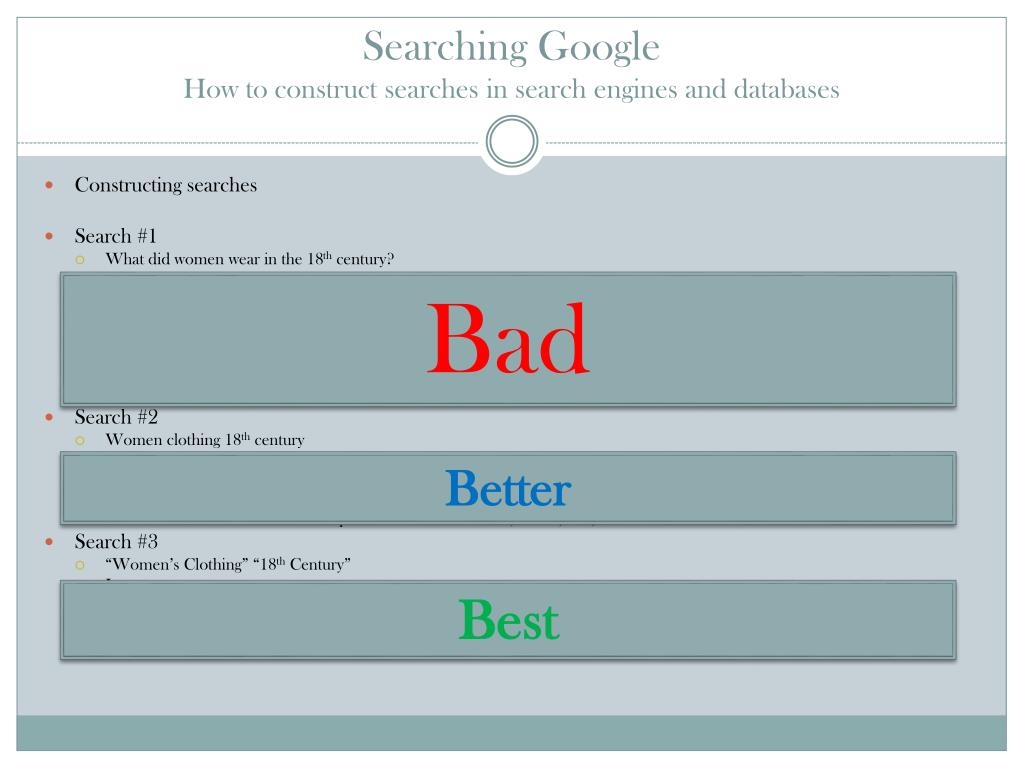 Searching GoogleHow to construct searches in search engines and databases • Constructing searches • Search #1 • What did women wear in the 18th century? • Issues • 1) Google doesn’t recognize special characters such as ? • 2) Google will now search each individual word. • Why this works • Google understands popular results • Populates the first page with what it thinks the user wants. (People rarely go past the first page) • Search #2 • Women clothing 18th century • Issues • 1) Google still searches individual words • Why this works • This search takes out the non-important words such as “did”, “what”, “in”, and “the” • Search #3 • “Women’s Clothing” “18th Century” • Issues • This search may not bring up some popular sites that Search #1 would retrieve • Why this works • This search will look for two phrases found on the same webpage. “women’s clothing” and “18th Century” Bad Better Best