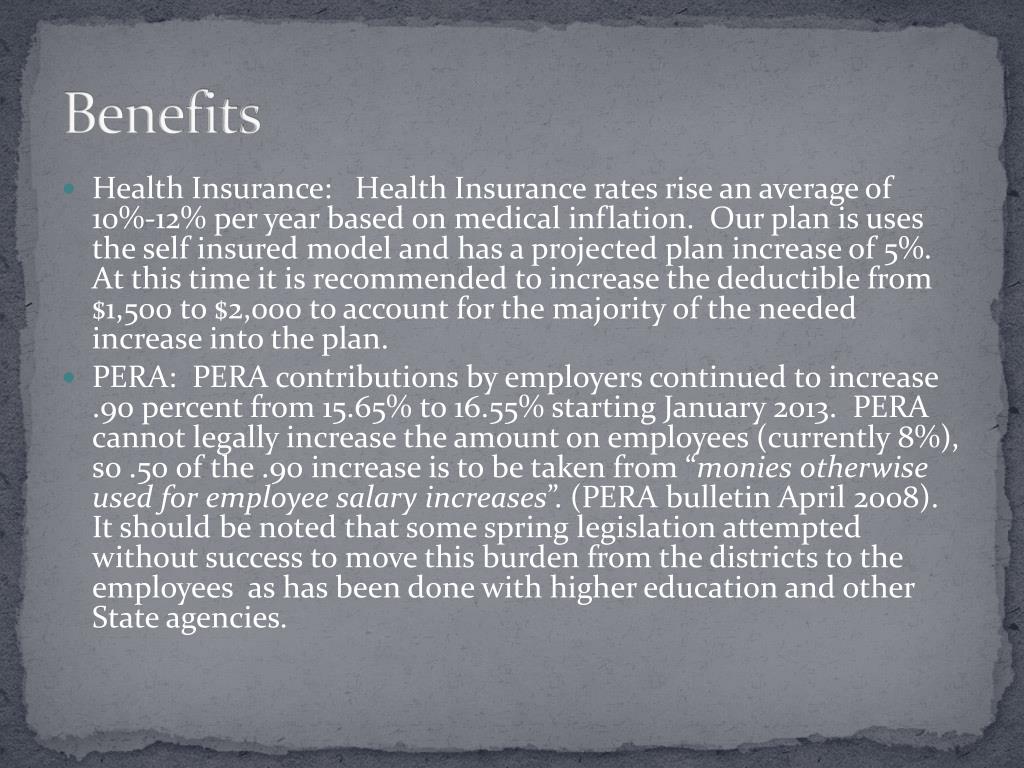 Benefits • Health Insurance: Health Insurance rates rise an average of 10%-12% per year based on medical inflation. Our plan is uses the self insured model and has a projected plan increase of 5%. At this time it is recommended to increase the deductible from $1,500 to $2,000 to account for the majority of the needed increase into the plan. • PERA: PERA contributions by employers continued to increase .90 percent from 15.65% to 16.55% starting January 2013. PERA cannot legally increase the amount on employees (currently 8%), so .50 of the .90 increase is to be taken from “monies otherwise used for employee salary increases”. (PERA bulletin April 2008). It should be noted that some spring legislation attempted without success to move this burden from the districts to the employees as has been done with higher education and other State agencies.