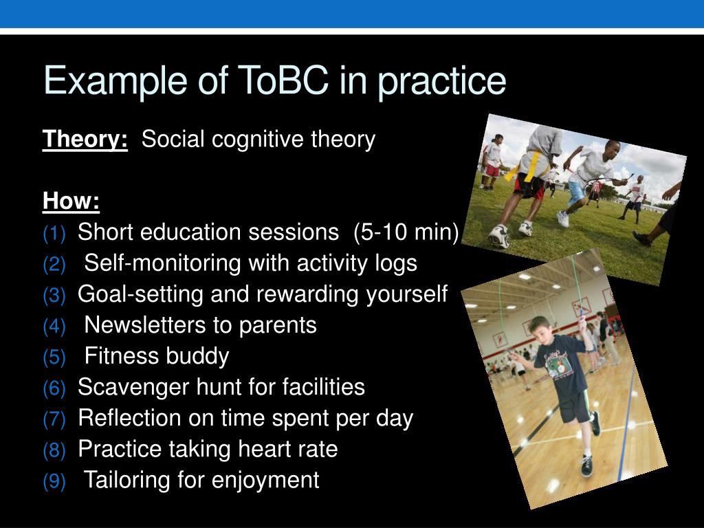 Example of ToBC in practice Problem: Middle school youth overweight and inactive Individual factors: Didn’t prioritize exercise; wasn’t on their radar screen Environmental constraint: Bad gym facilities Grim, ML & Pazmino-Cevallos, M. (2007). Using social cognitive theory in physical education: an example of the translation of research into practice. The Journal of the Virginia Association for Health, Physical Education, Recreation and Dance.