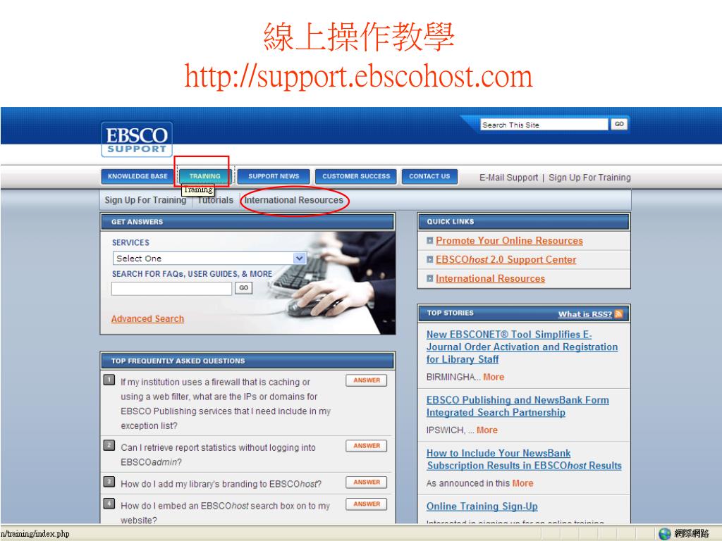 中文線上語音教學 • EBSCOhost基本檢索 • http://support.ebscohost.com/training/lang/zh/zh-tw-t/tutorials/Basic_Search/Basic_Search.html • EBSCOhost進階引導式檢索 • http://support.ebscohost.com/training/lang/zh/zh-tw-t/tutorials/Advanced_Search/Advanced_Search.html • EBSCOhost設限值與擴增值設定 • http://support.ebscohost.com/training/lang/zh/zh-tw-t/tutorials/Limter_and_Expender/Limter_and_Expender.html