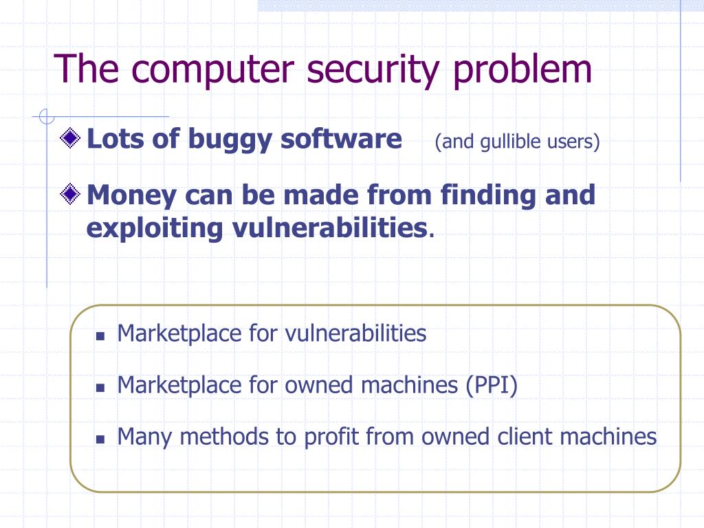 The computer security problem • Lots of buggy software (and gullible users) • Money can be made from finding and exploiting vulnerabilities. • Marketplace for vulnerabilities • Marketplace for owned machines (PPI) • Many methods to profit from owned client machines