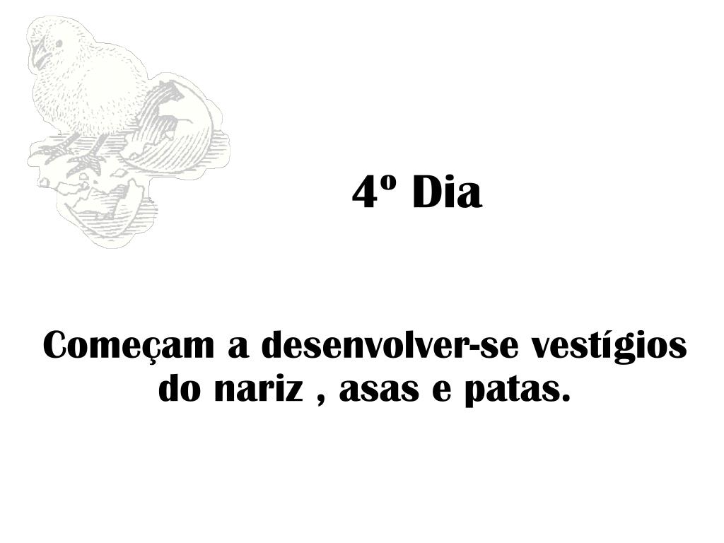4º Dia Começam a desenvolver-se vestígios do nariz , asas e patas.