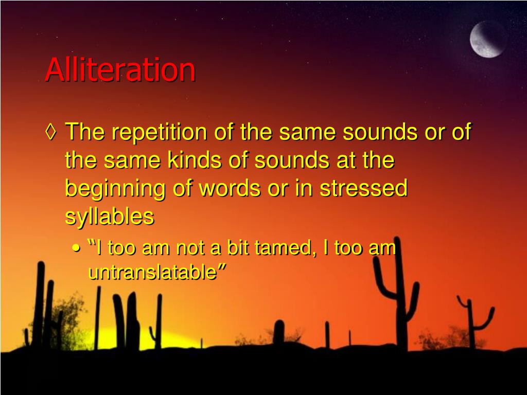Alliteration • The repetition of the same sounds or of the same kinds of sounds at the beginning of words or in stressed syllables • “I too am not a bit tamed, I too am untranslatable”