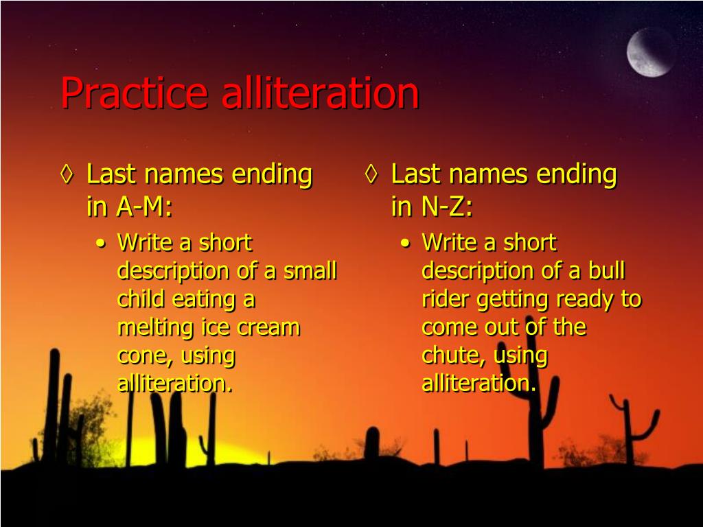 Last names ending in A-M: Write a short description of a small child eating a melting ice cream cone, using alliteration. Last names ending in N-Z: Write a short description of a bull rider getting ready to come out of the chute, using alliteration. Practice alliteration