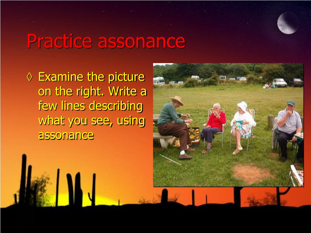 Practice assonance • Examine the picture on the right. Write a few lines describing what you see, using assonance