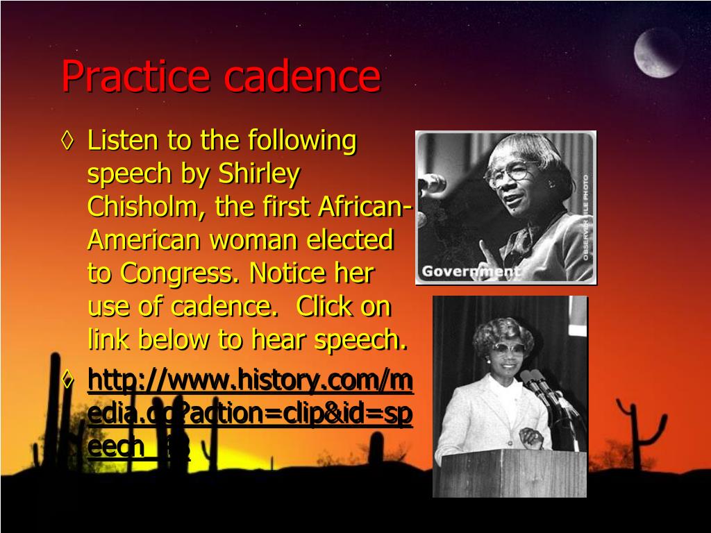 Practice cadence • Listen to the following speech by Shirley Chisholm, the first African-American woman elected to Congress. Notice her use of cadence. Click on link below to hear speech. • http://www.history.com/media.do?action=clip&id=speech_48