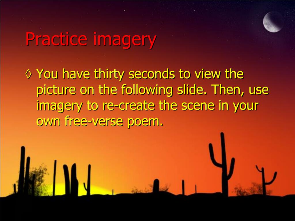 Practice imagery • You have thirty seconds to view the picture on the following slide. Then, use imagery to re-create the scene in your own free-verse poem.