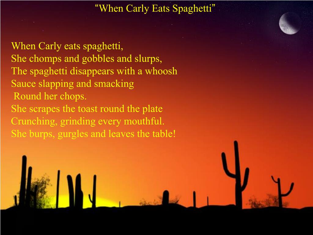 “When Carly Eats Spaghetti” When Carly eats spaghetti, She chomps and gobbles and slurps, The spaghetti disappears with a whoosh Sauce slapping and smacking Round her chops. She scrapes the toast round the plate Crunching, grinding every mouthful. She burps, gurgles and leaves the table!