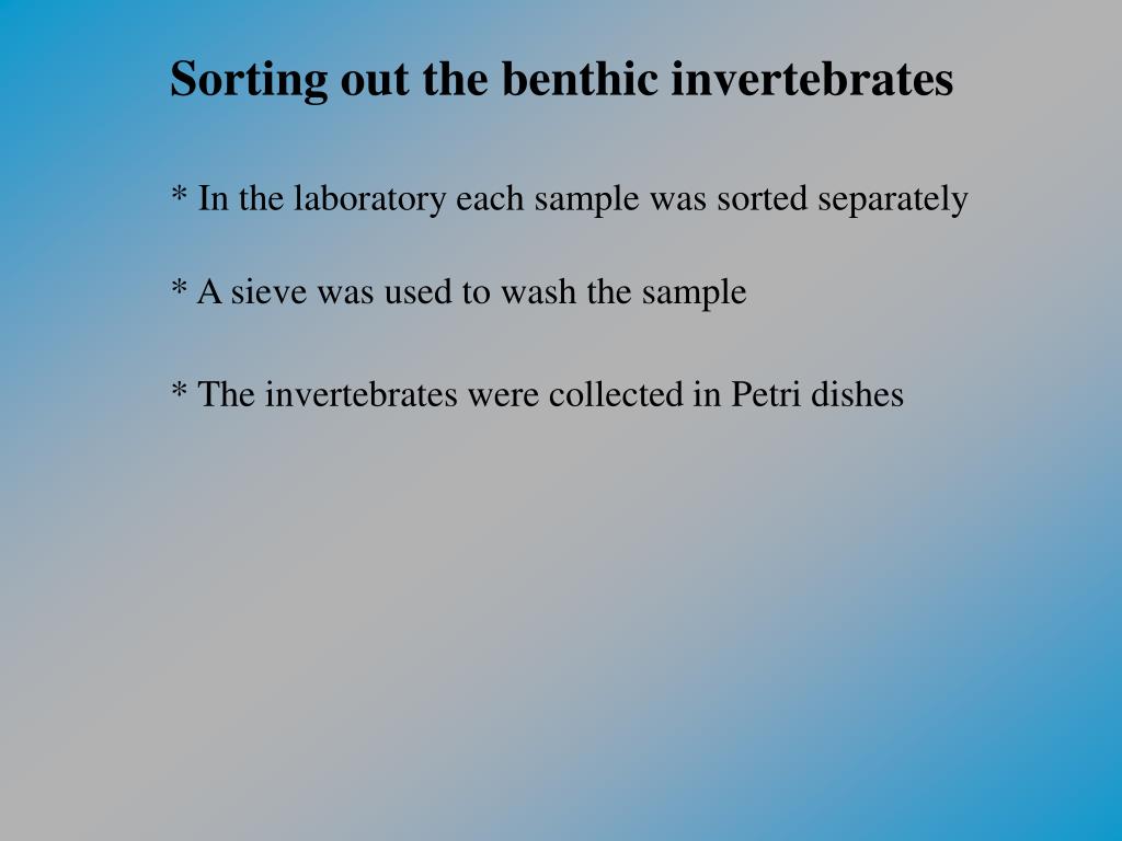 Sorting out the benthic invertebrates * In the laboratory each sample was sorted separately * A sieve was used to wash the sample * The invertebrates were collected in Petri dishes