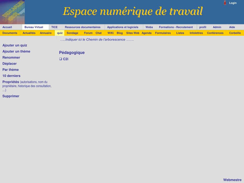 Login Espace numérique de travail Accueil Bureau Virtuel TICE Ressources documentaires Applications et logiciels Webs Formations - Recrutement profil Admin Aide Documents Actualités Annuaire quiz …..Indiquer ici le Chemin de l’arborescence ……. Pédagogique • C2i Sondage Forum Chat WiKi Blog Sites Web Agenda Formulaires Listes Infolettres Conférences Corbeille Ajouter un quiz Ajouter un thème Renommer Déplacer Par thème 10 derniers Propriétés (autorisations, nom du propriétaire, historique des consultation, …) Supprimer Webmestre