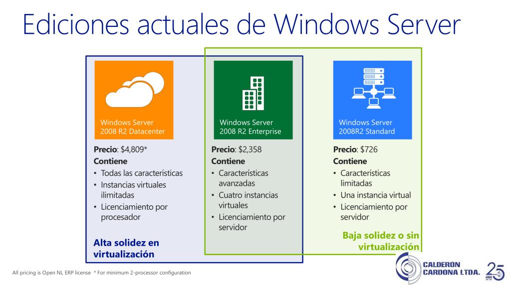 Ediciones actuales de Windows Server Windows Server2008 R2 Enterprise Windows Server2008R2 Standard Windows Server2008 R2 Datacenter • Precio: $4,809* • Contiene • Todas las características • Instancias virtuales ilimitadas • Licenciamiento por procesador • Precio: $2,358 • Contiene • Características avanzadas • Cuatro instancias virtuales • Licenciamiento por servidor • Precio: $726 • Contiene • Características limitadas • Una instancia virtual • Licenciamiento por servidor Baja solidez o sin virtualización Alta solidez en virtualización All pricing is Open NL ERP license * For minimum 2-processor configuration