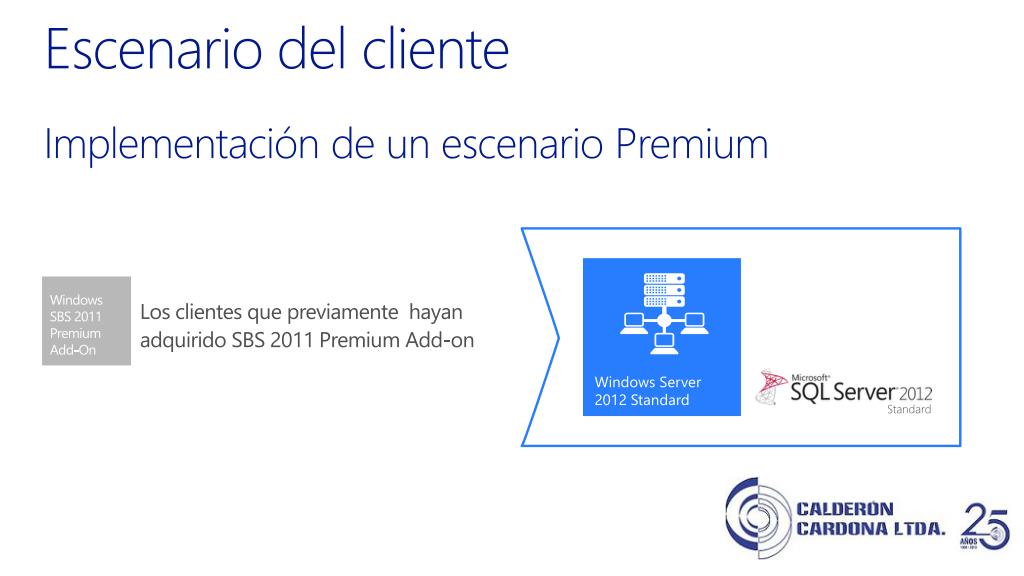 Escenario del cliente Implementación de un escenario Premium Los clientes que previamente hayan adquirido SBS 2011 Premium Add-on Windows Server2012 Standard Windows SBS 2011 Premium Add-On Standard