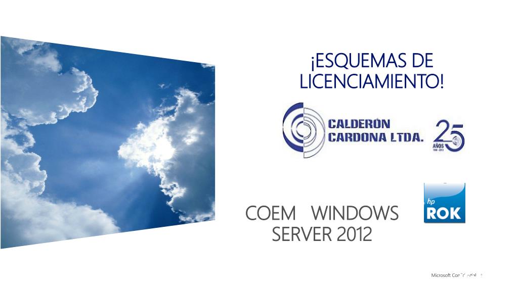 LICENCIAMIENTO OEM (Original EquipmentManufacturer). Es aquel en el que el fabricante o los canales de distribución, venden Servidores nuevos + la licencia . Es habitualmente la manera más fácil y económica de adquirir el sistema operativo Windows Server: • COEM: Son licenciasdistribuidaspor Microsoft paraservidoresnuevos de todaslasmarcas. • ROK: ResellerOption Kit:Es un esquema de licenciamiento OEM para sistemas operativos de servidor Microsoft, distribuido por HP e IBM en Colombia. • • Licencia para Servidores HP ó IBM con acceso para usuarios incluidos • • Soporte de HW y SW dado por el fabricante los primeros 90 días de la compra • • Drivers de instalación incluidos