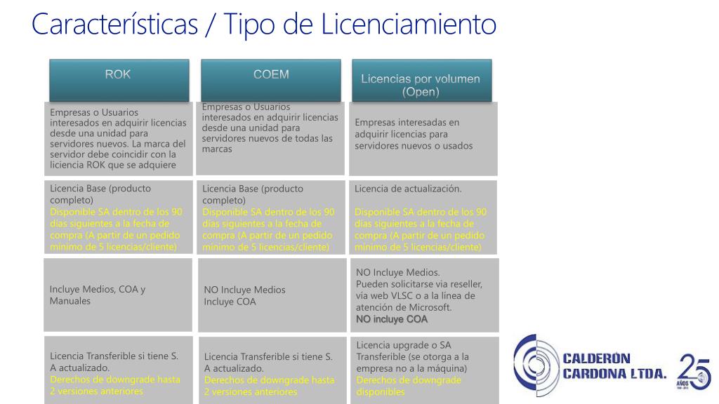Características / Tipo de Licenciamiento • Empresas o Usuarios interesados en adquirir licencias desde una unidad para servidores nuevos de todas las marcas Empresas o Usuarios interesados en adquirir licencias desde una unidad para servidores nuevos. La marca del servidor debe coincidir con la liciencia ROK que se adquiere • Empresas interesadas en adquirir licencias para servidores nuevos o usados ROK COEM Licencias por volumen (Open) Licencia Base (producto completo) Disponible SA dentro de los 90 días siguientes a la fecha de compra (A partir de un pedido mínimo de 5 licencias/cliente) Licencia Base (producto completo) Disponible SA dentro de los 90 días siguientes a la fecha de compra (A partir de un pedido mínimo de 5 licencias/cliente) Licencia de actualización. Disponible SA dentro de los 90 días siguientes a la fecha de compra (A partir de un pedido mínimo de 5 licencias/cliente) Incluye Medios, COA y Manuales NO Incluye Medios Incluye COA • NO Incluye Medios. • Pueden solicitarse viareseller, vía web VLSC o a la línea de atención de Microsoft. • NO incluye COA Licencia Transferible si tiene S. A actualizado. Derechos de downgrade hasta 2 versiones anteriores Licencia Transferible si tiene S. A actualizado. Derechos de downgrade hasta 2 versiones anteriores Licencia upgrade o SA Transferible (se otorga a la empresa no a la máquina) Derechos de downgrade disponibles