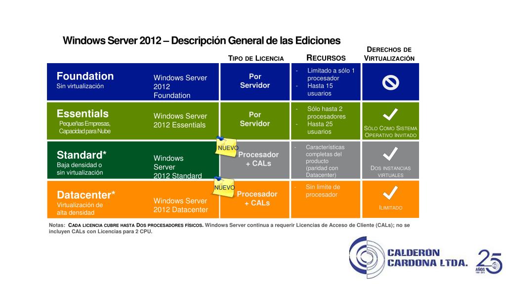 Comparacion de precios para Windows ServerCaracteristicas adicionales y derechos de virtualizacion • Windows Server2008 R2 Datacenter • Windows Server2008 R2 Standard • Windows Server2012 Datacenter • Windows Server2012 Standard * License is sold to cover one processor, but license rules require a minimum of two-processor coverage. Additions/Enhancements