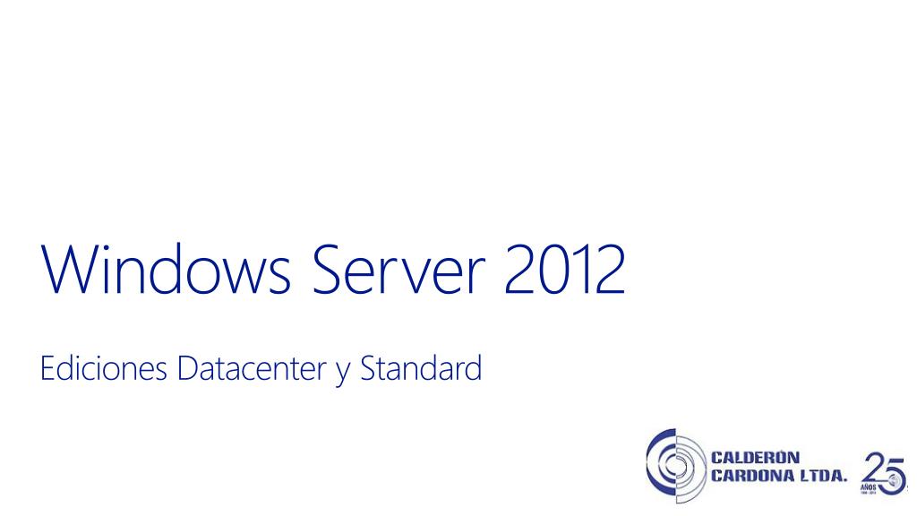 Ediciones de Windows Server 2012 Windows Server2012 Standard Windows Server2012 Datacenter • Precio: $4,809 • Contiene • Todas las características • Instancias virtuales ilimitadas • Licenciamiento basado en procesador • Precio: $882 • Contiene • Todas las características • Dos instancias virtuales • Licenciamiento basado en procesador Alta solidez en virtualización Baja solidez o no sin virtualización All pricing is Open NL ERP license Windows Server 2012 will also include the following small business editions: Essentials Edition and Foundation Edition.