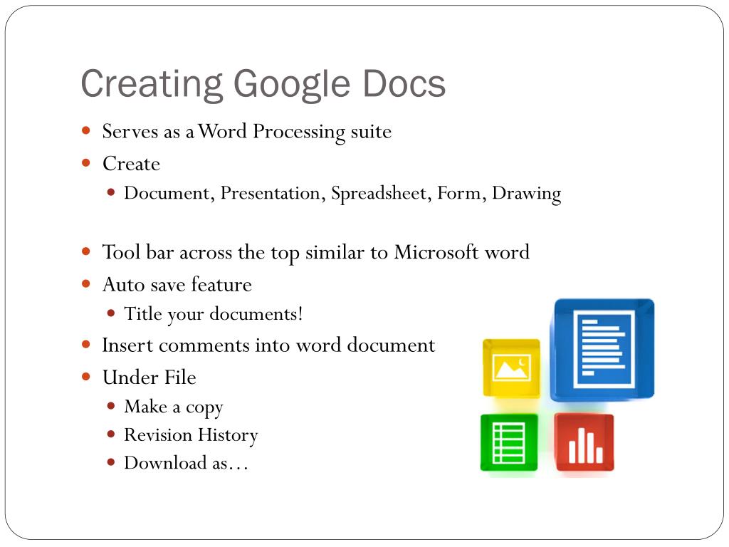 Creating Google Docs • Serves as a Word Processing suite • Create • Document, Presentation, Spreadsheet, Form, Drawing • Tool bar across the top similar to Microsoft word • Auto save feature • Title your documents! • Insert comments into word document • Under File • Make a copy • Revision History • Download as…