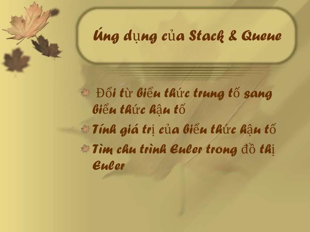Úng dụng của Stack & Queue • Đổi từ biểu thức trung tố sang biểu thức hậu tố • Tính giá trị của biểu thức hậu tố • Tìm chu trình Euler trong đồ thị Euler