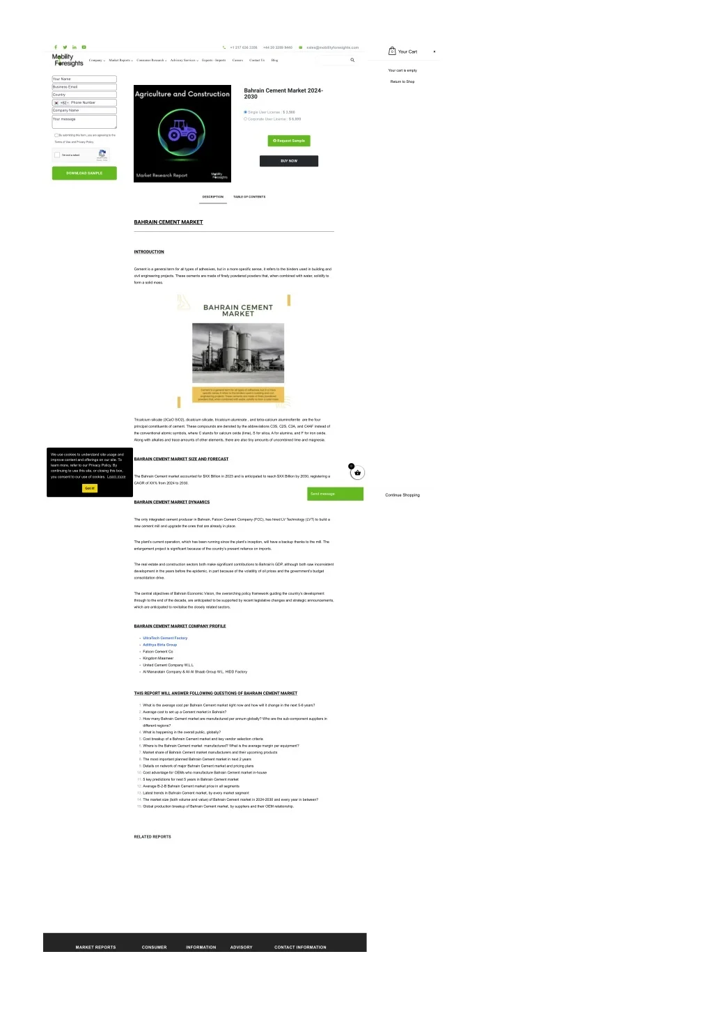 +1 217 636 3356 +44 20 3289 9440 sales@mobilityforesights.com Your Cart 0 Company Market Reports Consumer Research Advisory Services Exports - Imports Careers Contact Us Blog Your cart is empty Your Name Return to Shop Business Email Bahrain Cement Market 2024- 2030 Country Phone Number +82 Company Name Single User License : $ 3,500 Your message Corporate User License : $ 6,000 By submitting this form, you are agreeing to the Request Sample Terms of Use and Privacy Policy. I'm not a robot reCAPTCHA Privacy - Terms BUY NOW DOWNLOAD SAMPLE DESCRIPTION TABLE OF CONTENTS BAHRAIN CEMENT MARKET INTRODUCTION Cement is a general term for all types of adhesives, but in a more specific sense, it refers to the binders used in building and civil engineering projects. These cements are made of finely powdered powders that, when combined with water, solidify to form a solid mass. Tricalcium silicate (3CaO SiO2), dicalcium silicate, tricalcium aluminate , and tetra-calcium aluminoferrite are the four principal constituents of cement. These compounds are denoted by the abbreviations C3S, C2S, C3A, and C4AF instead of the conventional atomic symbols, where C stands for calcium oxide (lime), S for silica, A for alumina, and F for iron oxide. Along with alkalies and trace amounts of other elements, there are also tiny amounts of uncombined lime and magnesia. We use cookies to understand site usage and improve content and offerings on our site. To learn more, refer to our Privacy Policy. By continuing to use this site, or closing this box, BAHRAIN CEMENT MARKET SIZE AND FORECAST 0 The Bahrain Cement market accounted for $XX Billion in 2023 and is anticipated to reach $XX Billion by 2030, registering a Learn more you consent to our use of cookies. CAGR of XX% from 2024 to 2030. Got it! Send message Continue Shopping BAHRAIN CEMENT MARKET DYNAMICS The only integrated cement producer in Bahrain, Falcon Cement Company (FCC), has hired LV Technology (LVT) to build a new cement mill and upgrade the ones that are already in place. The plant’s current operation, which has been running since the plant’s inception, will have a backup thanks to the mill. The enlargement project is significant because of the country’s present reliance on imports. The real estate and construction sectors both make significant contributions to Bahrain’s GDP, although both saw inconsistent development in the years before the epidemic, in part because of the volatility of oil prices and the government’s budget consolidation drive. The central objectives of Bahrain Economic Vision, the overarching policy framework guiding the country’s development through to the end of the decade, are anticipated to be supported by recent legislative changes and strategic announcements, which are anticipated to revitalise the closely related sectors. BAHRAIN CEMENT MARKET COMPANY PROFILE UltraTech Cement Factory Adithya Birla Group Falcon Cement Co Kingdom Maameer United Cement Company W.L.L Al Manaratain Company & Ali Al Shaab Group W.L. HIDD Factory THIS REPORT WILL ANSWER FOLLOWING QUESTIONS OF BAHRAIN CEMENT MARKET 1. What is the average cost per Bahrain Cement market right now and how will it change in the next 5-6 years? 2. Average cost to set up a Cement market in Bahrain? 3. How many Bahrain Cement market are manufactured per annum globally? Who are the sub-component suppliers in different regions? 4. What is happening in the overall public, globally? 5. Cost breakup of a Bahrain Cement market and key vendor selection criteria 6. Where is the Bahrain Cement market manufactured? What is the average margin per equipment? 7. Market share of Bahrain Cement market manufacturers and their upcoming products 8. The most important planned Bahrain Cement market in next 2 years 9. Details on network of major Bahrain Cement market and pricing plans 10. Cost advantage for OEMs who manufacture Bahrain Cement market in-house 11. 5 key predictions for next 5 years in Bahrain Cement market 12. Average B-2-B Bahrain Cement market price in all segments 13. Latest trends in Bahrain Cement market, by every market segment 14. The market size (both volume and value) of Bahrain Cement market in 2024-2030 and every year in between? 15. Global production breakup of Bahrain Cement market, by suppliers and their OEM relationship. RELATED REPORTS MARKET REPORTS CONSUMER INFORMATION ADVISORY CONTACT INFORMATION