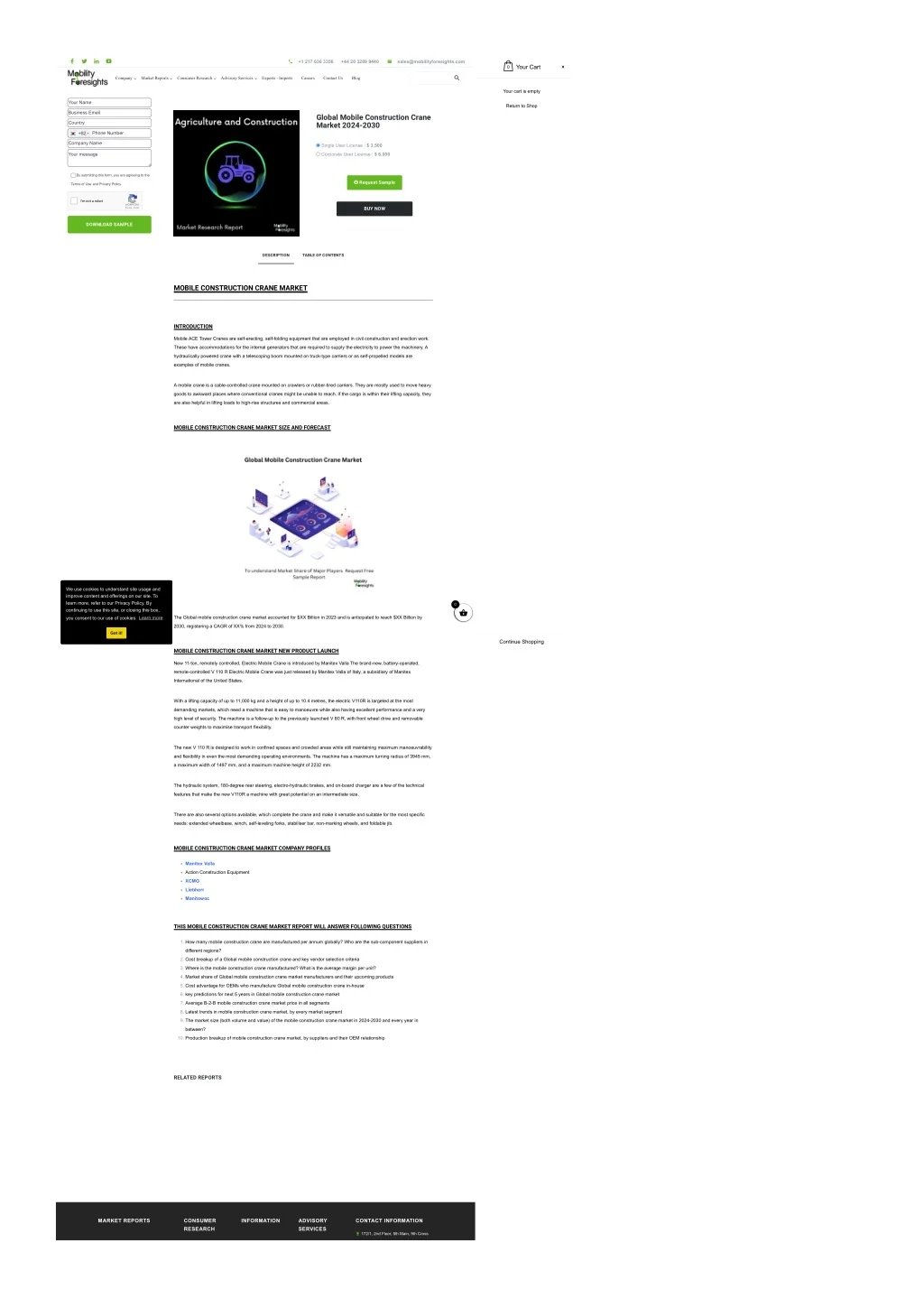+1 217 636 3356 +44 20 3289 9440 sales@mobilityforesights.com Your Cart 0 Company Market Reports Consumer Research Advisory Services Exports - Imports Careers Contact Us Blog Your cart is empty Your Name Return to Shop Business Email Global Mobile Construction Crane Market 2024-2030 Country Phone Number +82 Company Name Single User License : $ 3,500 Your message Corporate User License : $ 6,000 By submitting this form, you are agreeing to the Request Sample Terms of Use and Privacy Policy. I'm not a robot reCAPTCHA Privacy - Terms BUY NOW DOWNLOAD SAMPLE DESCRIPTION TABLE OF CONTENTS MOBILE CONSTRUCTION CRANE MARKET INTRODUCTION Mobile ACE Tower Cranes are self-erecting, self-folding equipment that are employed in civil construction and erection work. These have accommodations for the internal generators that are required to supply the electricity to power the machinery. A hydraulically powered crane with a telescoping boom mounted on truck-type carriers or as self-propelled models are examples of mobile cranes. A mobile crane is a cable-controlled crane mounted on crawlers or rubber-tired carriers. They are mostly used to move heavy goods to awkward places where conventional cranes might be unable to reach. If the cargo is within their lifting capacity, they are also helpful in lifting loads to high-rise structures and commercial areas. MOBILE CONSTRUCTION CRANE MARKET SIZE AND FORECAST We use cookies to understand site usage and improve content and offerings on our site. To learn more, refer to our Privacy Policy. By continuing to use this site, or closing this box, 0 The Global mobile construction crane market accounted for $XX Billion in 2023 and is anticipated to reach $XX Billion by Learn more you consent to our use of cookies. 2030, registering a CAGR of XX% from 2024 to 2030. Got it! Continue Shopping MOBILE CONSTRUCTION CRANE MARKET NEW PRODUCT LAUNCH New 11-ton, remotely controlled, Electric Mobile Crane is introduced by Manitex Valla The brand-new, battery-operated, remote-controlled V 110 R Electric Mobile Crane was just released by Manitex Valla of Italy, a subsidiary of Manitex International of the United States. With a lifting capacity of up to 11,000 kg and a height of up to 10.4 metres, the electric V110R is targeted at the most demanding markets, which need a machine that is easy to manoeuvre while also having excellent performance and a very high level of security. The machine is a follow-up to the previously launched V 80 R, with front wheel drive and removable counter weights to maximise transport flexibility. The new V 110 R is designed to work in confined spaces and crowded areas while still maintaining maximum manoeuvrability and flexibility in even the most demanding operating environments. The machine has a maximum turning radius of 3945 mm, a maximum width of 1497 mm, and a maximum machine height of 2232 mm. The hydraulic system, 180-degree rear steering, electro-hydraulic brakes, and on-board charger are a few of the technical features that make the new V110R a machine with great potential on an intermediate size. There are also several options available, which complete the crane and make it versatile and suitable for the most specific needs: extended wheelbase, winch, self-leveling forks, stabiliser bar, non-marking wheels, and foldable jib. MOBILE CONSTRUCTION CRANE MARKET COMPANY PROFILES Manitex Valla Action Construction Equipment XCMG Liebherr Manitowoc THIS MOBILE CONSTRUCTION CRANE MARKET REPORT WILL ANSWER FOLLOWING QUESTIONS 1. How many mobile construction crane are manufactured per annum globally? Who are the sub-component suppliers in different regions? 2. Cost breakup of a Global mobile construction crane and key vendor selection criteria 3. Where is the mobile construction crane manufactured? What is the average margin per unit? 4. Market share of Global mobile construction crane market manufacturers and their upcoming products 5. Cost advantage for OEMs who manufacture Global mobile construction crane in-house 6. key predictions for next 5 years in Global mobile construction crane market 7. Average B-2-B mobile construction crane market price in all segments 8. Latest trends in mobile construction crane market, by every market segment 9. The market size (both volume and value) of the mobile construction crane market in 2024-2030 and every year in between? 10. Production breakup of mobile construction crane market, by suppliers and their OEM relationship RELATED REPORTS MARKET REPORTS CONSUMER RESEARCH INFORMATION ADVISORY SERVICES CONTACT INFORMATION 172/1, 2nd Floor, 5th Main, 9th Cross
