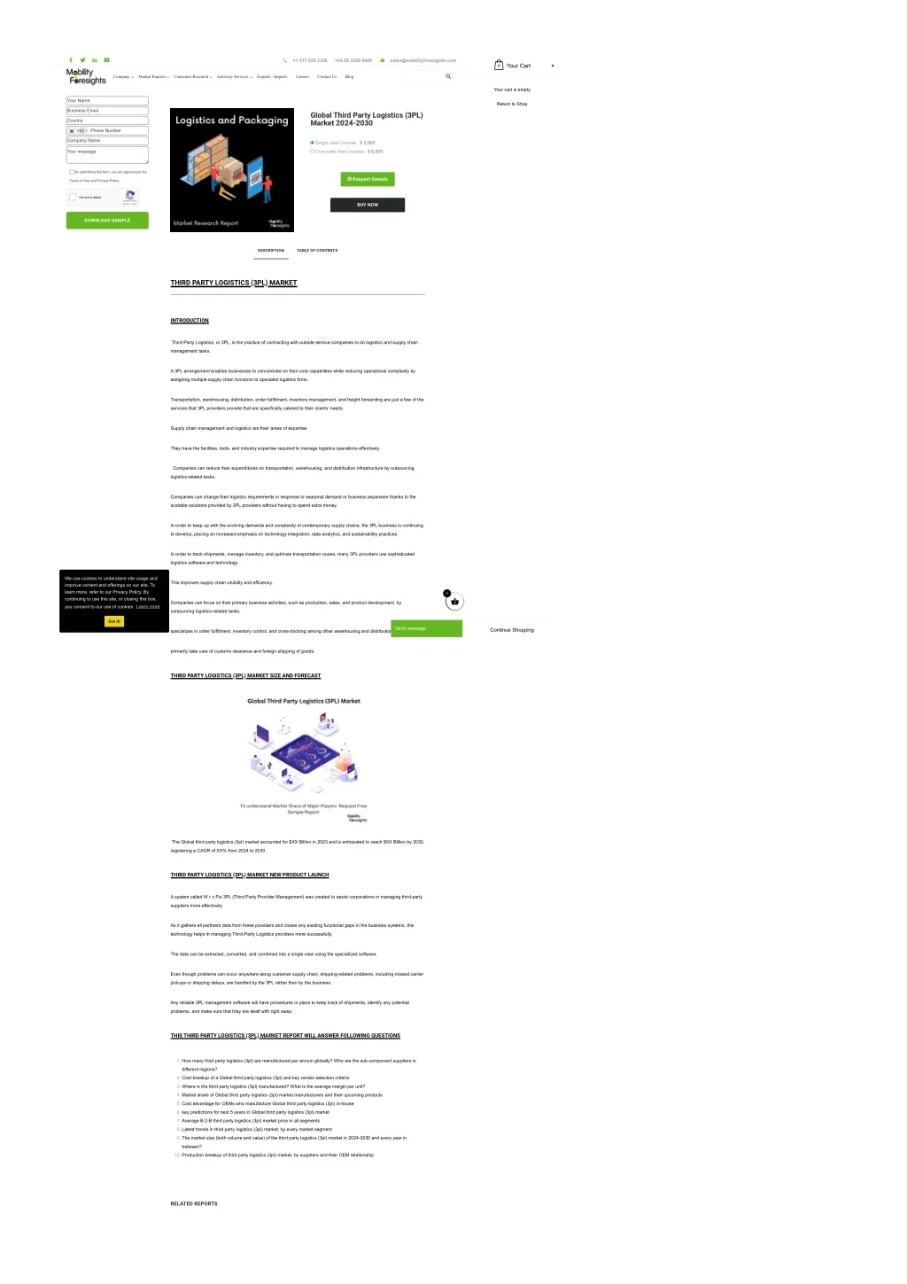 +1 217 636 3356 +44 20 3289 9440 sales@mobilityforesights.com Your Cart 0 Company Market Reports Consumer Research Advisory Services Exports - Imports Careers Contact Us Blog Your cart is empty Your Name Return to Shop Business Email Global Third Party Logistics (3PL) Market 2024-2030 Country Phone Number +82 Company Name Single User License : $ 3,500 Your message Corporate User License : $ 6,000 By submitting this form, you are agreeing to the Request Sample Terms of Use and Privacy Policy. I'm not a robot reCAPTCHA Privacy - Terms BUY NOW DOWNLOAD SAMPLE DESCRIPTION TABLE OF CONTENTS THIRD PARTY LOGISTICS (3PL) MARKET INTRODUCTION Third-Party Logistics, or 3PL, is the practice of contracting with outside service companies to do logistics and supply chain management tasks. A 3PL arrangement enables businesses to concentrate on their core capabilities while reducing operational complexity by assigning multiple supply chain functions to specialist logistics firms. Transportation, warehousing, distribution, order fulfillment, inventory management, and freight forwarding are just a few of the services that 3PL providers provide that are specifically catered to their clients’ needs. Supply chain management and logistics are their areas of expertise. They have the facilities, tools, and industry expertise required to manage logistics operations effectively. Companies can reduce their expenditures on transportation, warehousing, and distribution infrastructure by outsourcing logistics-related tasks. Companies can change their logistics requirements in response to seasonal demand or business expansion thanks to the scalable solutions provided by 3PL providers without having to spend extra money. In order to keep up with the evolving demands and complexity of contemporary supply chains, the 3PL business is continuing to develop, placing an increased emphasis on technology integration, data analytics, and sustainability practices. In order to track shipments, manage inventory, and optimize transportation routes, many 3PL providers use sophisticated logistics software and technology. We use cookies to understand site usage and improve content and offerings on our site. To learn more, refer to our Privacy Policy. By continuing to use this site, or closing this box, This improves supply chain visibility and efficiency. 0 Companies can focus on their primary business activities, such as production, sales, and product development, by Learn more you consent to our use of cookies. outsourcing logistics-related tasks. Got it! Send message Continue Shopping specializes in order fulfillment, inventory control, and cross-docking among other warehousing and distribution services. primarily take care of customs clearance and foreign shipping of goods. THIRD PARTY LOGISTICS (3PL) MARKET SIZE AND FORECAST The Global third party logistics (3pl) market accounted for $XX Billion in 2023 and is anticipated to reach $XX Billion by 2030, registering a CAGR of XX% from 2024 to 2030. THIRD PARTY LOGISTICS (3PL) MARKET NEW PRODUCT LAUNCH A system called W r x Flo 3PL (Third Party Provider Management) was created to assist corporations in managing third-party suppliers more effectively. As it gathers all pertinent data from these providers and closes any existing functional gaps in the business systems, this technology helps in managing Third-Party Logistics providers more successfully. The data can be extracted, converted, and combined into a single view using the specialized software. Even though problems can occur anywhere along customer supply chain, shipping-related problems, including missed carrier pickups or shipping delays, are handled by the 3PL rather than by the business. Any reliable 3PL management software will have procedures in place to keep track of shipments, identify any potential problems, and make sure that they are dealt with right away. THIS THIRD PARTY LOGISTICS (3PL) MARKET REPORT WILL ANSWER FOLLOWING QUESTIONS 1. How many third party logistics (3pl) are manufactured per annum globally? Who are the sub-component suppliers in different regions? 2. Cost breakup of a Global third party logistics (3pl) and key vendor selection criteria 3. Where is the third party logistics (3pl) manufactured? What is the average margin per unit? 4. Market share of Global third party logistics (3pl) market manufacturers and their upcoming products 5. Cost advantage for OEMs who manufacture Global third party logistics (3pl) in-house 6. key predictions for next 5 years in Global third party logistics (3pl) market 7. Average B-2-B third party logistics (3pl) market price in all segments 8. Latest trends in third party logistics (3pl) market, by every market segment 9. The market size (both volume and value) of the third party logistics (3pl) market in 2024-2030 and every year in between? 10. Production breakup of third party logistics (3pl) market, by suppliers and their OEM relationship RELATED REPORTS