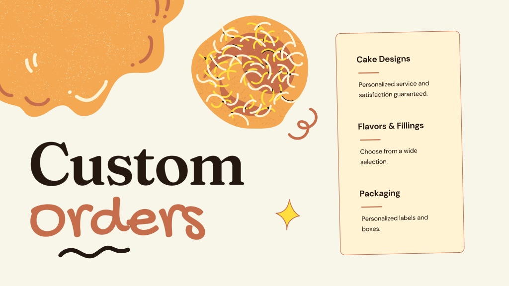 Cake Designs Personalized service and satisfaction guaranteed. Flavors & Fillings Choose from a wide selection. Custom Packaging Orders Personalized labels and boxes.