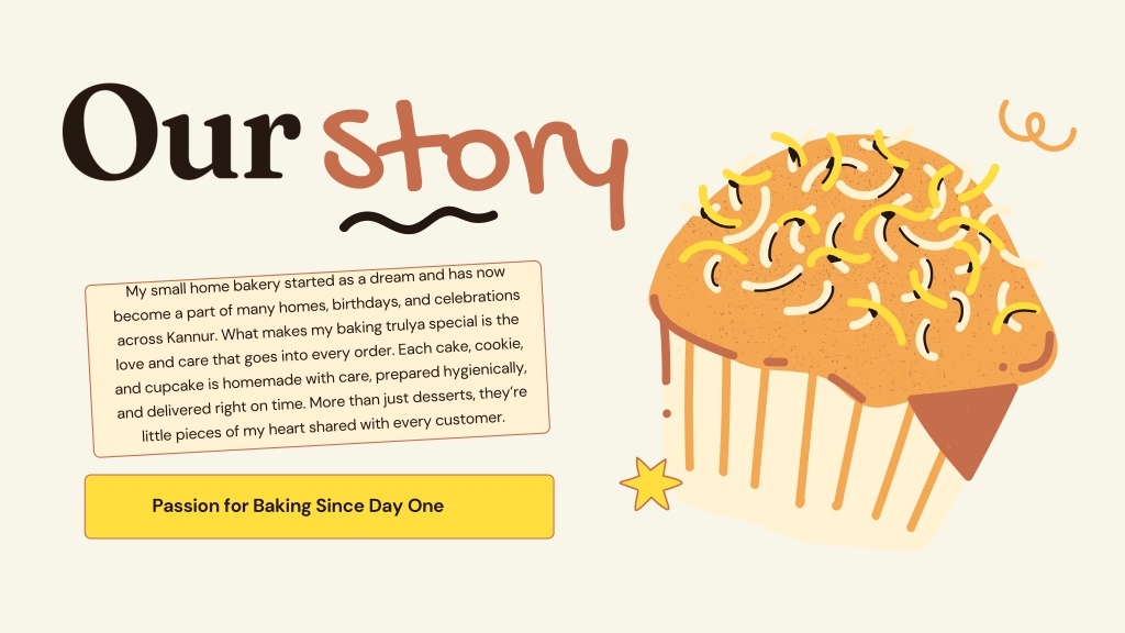 Our Story My small home bakery started as a dream and has now become a part of many homes, birthdays, and celebrations across Kannur. What makes my baking trulya special is the love and care that goes into every order. Each cake, cookie, and cupcake is homemade with care, prepared hygienically, and delivered right on time. More than just desserts, they’re little pieces of my heart shared with every customer. Passion for Baking Since Day One