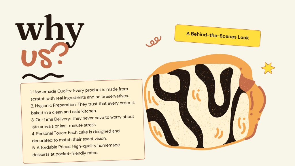 why A Behind-the-Scenes Look us? 1. Homemade Quality: Every product is made from scratch with real ingredients and no preservatives.. 2. Hygienic Preparation: They trust that every order is baked in a clean and safe kitchen. 3. On-Time Delivery: They never have to worry about late arrivals or last-minute stress. 4. Personal Touch: Each cake is designed and decorated to match their exact vision. 5. Affordable Prices: High-quality homemade desserts at pocket-friendly rates.