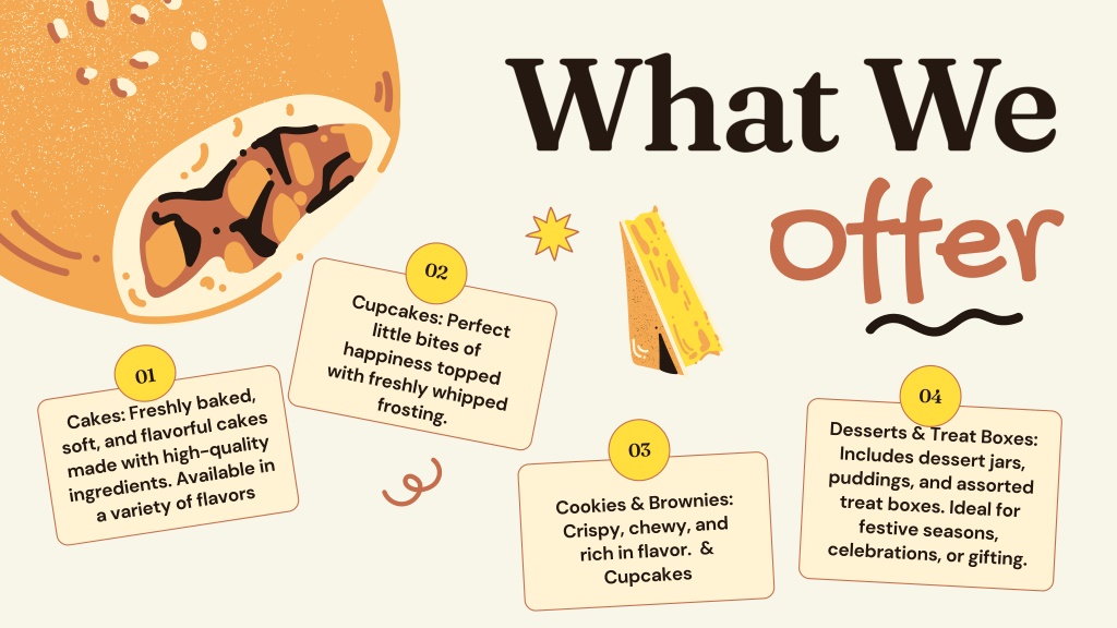 What We Offer 02 Cupcakes: Perfect little bites of happiness topped with freshly whipped frosting. 01 04 Cakes: Freshly baked, soft, and flavorful cakes made with high-quality ingredients. Available in a variety of flavors Desserts & Treat Boxes: Includes dessert jars, puddings, and assorted treat boxes. Ideal for festive seasons, celebrations, or gifting. 03 Cookies & Brownies: Crispy, chewy, and rich in flavor. & Cupcakes