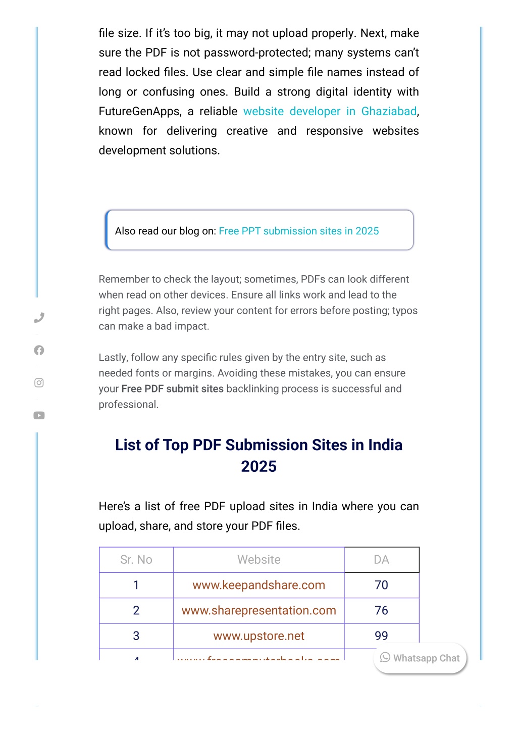 file size. If it’s too big, it may not upload properly. Next, make sure the PDF is not password-protected; many systems can’t read locked files. Use clear and simple file names instead of long or confusing ones. Build a strong digital identity with FutureGenApps, a reliable website developer in Ghaziabad, known for delivering creative and responsive websites development solutions. Also read our blog on: Free PPT submission sites in 2025 Remember to check the layout; sometimes, PDFs can look different when read on other devices. Ensure all links work and lead to the right pages. Also, review your content for errors before posting; typos can make a bad impact. Lastly, follow any specific rules given by the entry site, such as needed fonts or margins. Avoiding these mistakes, you can ensure your Free PDF submit sites backlinking process is successful and professional. List of Top PDF Submission Sites in India 2025 Here’s a list of free PDF upload sites in India where you can upload, share, and store your PDF files. Sr. No Website DA 1 www.keepandshare.com 70 2 www.sharepresentation.com 76 3 www.upstore.net 99 75 Whatsapp Chat 4 www.freecomputerbooks.com 5 www.send.tresorit.com 96