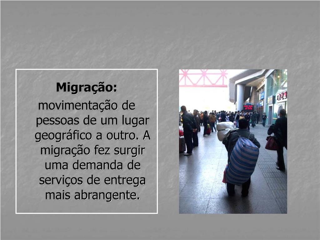 Migração: movimentação de pessoas de um lugar geográfico a outro. A migração fez surgir uma demanda de serviços de entrega mais abrangente.